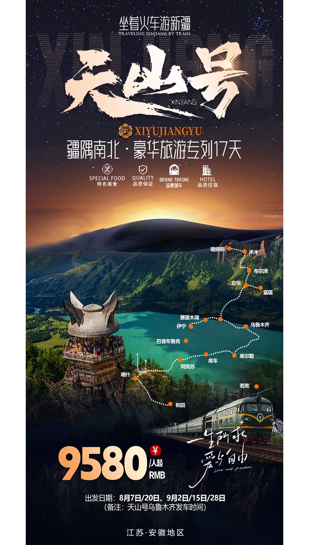 1.交通:往返交通硬臥(隨機(jī)出票)+天山號(hào)旅游專(zhuān)列硬臥/軟臥+目的地空調(diào)旅游大巴;