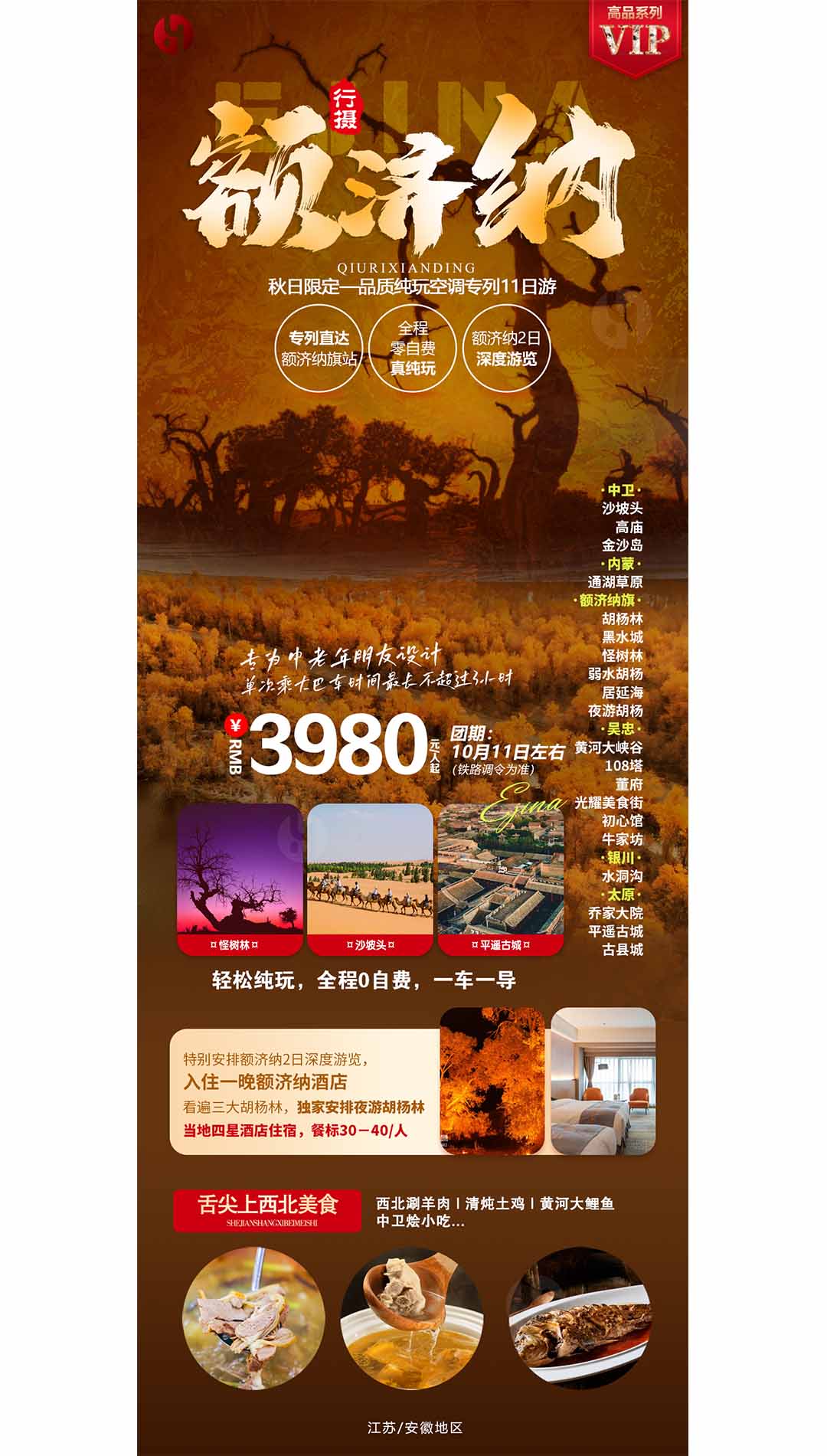 中衛(wèi)(沙坡頭、高廟、金沙島)、內蒙(通湖草原)、額濟納旗(胡楊林、黑水城、怪樹林、弱水胡楊、居延海、夜游胡楊)、吳忠(黃河大峽谷、108塔、董府、光耀美食街、初心館、牛家坊)、銀川(水洞溝、沃夫百瑞)、太原(喬家大院、平遙古城、古縣城)