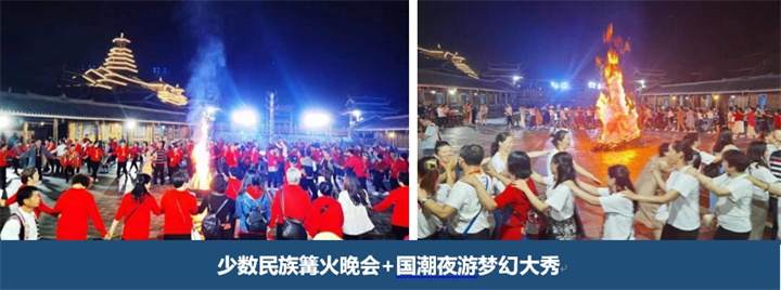 這是一場(chǎng)集廣西侗族苗族風(fēng)情的大型歌舞盛會(huì)。寧?kù)o的夜晚,明亮的繁星,燦爛的火光人們手拉手,在山清水秀的明亮篝火中,與身邊的朋友,一起跳舞、狂歡,放松心情。